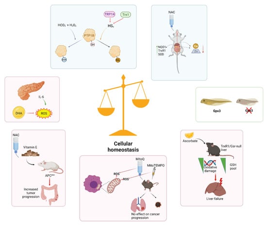 ROS-damaging effects are often associated with age-related disorders, such as neurodegenerative disorders, and cancer [4]. Even there, however, and perhaps more notably in the latter, clinical interventions aiming to compensate for excessive oxidative damage by dietary supplementation of antioxidants have had mixed effects [37,38,39,40,41,42]. To further complicate the picture, there is a lack of consensus in preclinical data. However, an increasing number of studies show that antioxidants can benefit the progression of cancer in endogenous models of cancer [43,44,45,46,47,48]. In fact, loss-of-function mutations in Keap1 resulting in constitutive Nrf2 activation have been observed in a substantial portion of lung cancer patients [49,50] and validated as driver mutations in mouse models of cancer [51,52], showing that tumor cells find ways to hijack the endogenous antioxidant systems. In a study conducted by Zou and colleagues, a mouse model of familial colorectal cancer was used in conjunction with dietary supplementation of either NAC or vitamin E, which revealed that antioxidant supplementation in ApcMin/+ mice enhanced parameters of intestinal tumor progression without affecting tumor initiation [47].