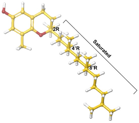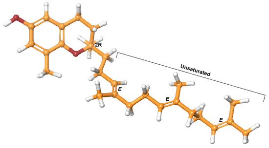 The more studied tocopherol homologues have a longer, saturated phytyl tail compared to that of tocotrienols [], the isomers of which have common 3-chiral stereocenters—C-2, C-4′ and C-8′ (Figure 1). Alpha-tocopherol is the most bioactive form, and along with γ-tocopherol, is the most common dietary form. It is worth noting that biological activity is unrelated to antioxidant activity []. One determinant of biological activity of an isomer is an affinity for α-tocopherol transfer protein (αTTP) []. This protein, primarily expressed in the liver, binds and improves the transfer of α-tocopherol between membranes and stimulates its release from hepatic cells []. Hosomi et al. demonstrated that αTTP preferentially binds α-tocopherol over the other tocopherol analogs and that there is a linear relationship between the relative affinity of tocopherol analogues and their biological activity []. At the same time, tocopherol supplementation has been shown to interfere with the bioavailability of other isoforms [,] Studies in the past two decades demonstrated that the isomers have distinct biological activities, and that the anticancer and anti-inflammatory activity of α-tocopherol is inferior to other, less-studied, isoforms [,].