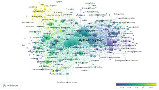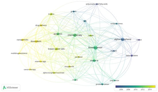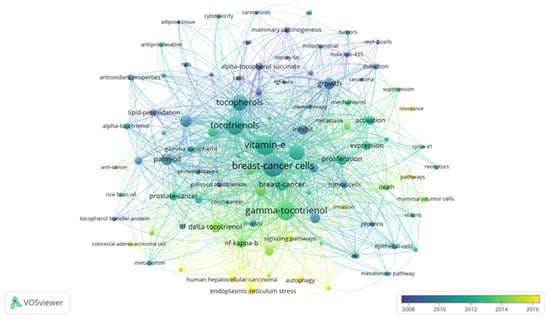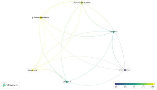 Bibliometrics are increasingly popular methods for analyzing scientific publications on a macroscale []. Applicable to scientists, institutions, journals, and countries, it gives insight into research productivity, discipline evolution, research relevancy, and contributions to scientific fields [,]. As the number of scientific publications increases, so does the utility of bibliometric methods []. To guide future studies, this review used bibliometric analysis to highlight trends in research surrounding the use of tocotrienols in breast cancer treatments. From the analysis, the networks generated with VOSviewer are shown in Figure 3, Figure 4, Figure 5 and Figure 6.