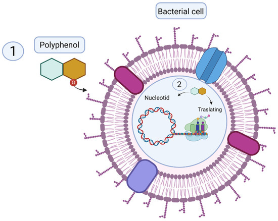 Antimicrobial mechanism of polyphenols. (1) The polyphenol molecule reacts with the proteins of the cell membrane of bacteria, causing lysis. (2) Inside the cell, it interferes with the synthesis of DNA and proteins, causing the death of the cell (created with BioRender.com, 3 July 2021).