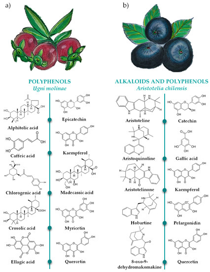 Main bioactive compounds present in the leaves of Ugni molinae Turcz (a) and Aristotelia chilensis (b) [73,74,75,76].