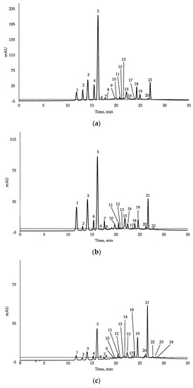 All data were reported as the mean ± standard deviation (SD), with at least three replications for each sample. Statistical evaluation was conducted by Duncan’s test to discriminate among the mean values. Pearson’s correlation was calculated to assess the correlation between antioxidant activity and individual compounds. All statistical analyses were performed using the software Statistica (StatSoft, Tulsa, OK, USA).