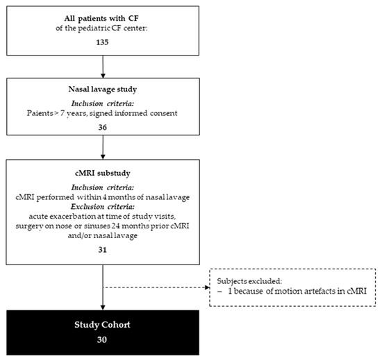 This study was conducted as a sub-study of an ongoing longitudinal study, in which nasal lavage samples were taken to monitor inflammatory parameters. The recruitment of study participants from patients at our CF center is shown in Figure 1. At the time of the MRI sub-study, 36 of the 135 patients with CF from our CF center were participating in the longitudinal study performing nasal lavages. After reviewing the inclusion and exclusion criteria, 5 patients had to be excluded for the MRI sub-study, so 31 patients with cystic fibrosis (median age 14 years, range 7–20 years) in a stable clinical condition were included. Clinical symptoms of sinonasal disease were present in 17 of these 31. Of those 17 patients, 6 had undergone sinus surgery or resection of polyps, but this was more than 24 months before the start of the study. Due to motion artefacts, the MRI of one patient had to be excluded from the statistical analysis. Thus, in the end, 30 patients were included in this study. Although this is only a sub-cohort of all patients with CF, it mirrors a representative cross-section of patients from our CF center, with 12 patients homozygous for F508del, 14 patients heterozygous for F508del, and 4 patients with other CFTR mutations. For further information on clinical characteristics, refer to Table 1.