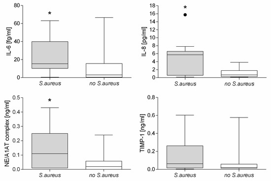 Comparison of the groups of patients with CF colonized with and without S. aureus for the inflammatory parameters IL-6, IL-8, the NE/A1AT complex and TIMP-1. Cytokine levels of IL-6 and IL-8, as well as of the NE/A1AT complex, were found to be significantly increased in patients with CF with colonization of S. aureus (* p < 0.05, ∙ outlier).