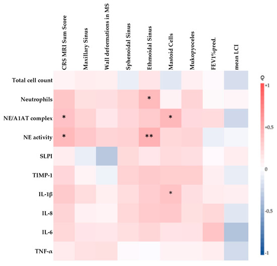 Spearman correlation of inflammatory parameters (NE/A1AT complex, SLPI, TIMP-1, IL1β, IL-6, IL-8, TNF-α) to MRI-scores of the sinuses and clinical parameters (pathogen colonization and lung function (FEV1%pred. and mean LCI)). * p < 0.05; ** p < 0.01. Abbreviations: MS = maxillary sinus.