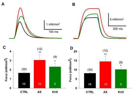 Increased EDL muscle force production in aging mice following AX and krill oil supplementation. Representative ex vivo twitch (A) and tetanic (B) force on EDL muscle from CTRL (black), AX (red) and krill oil (green) fed mice stimulated at 0.5 or 200 Hz, respectively, at room temperature (23–25 °C). The force was normalized to the cross-sectional area of the muscle. Averaged peak force of twitches (C) and tetani (D). The numbers in parenthesis indicate the number of muscles studied. The numbers in columns (italics) represent the number of animals used. * and ** denote significant difference from control at p < 0.05 and p < 0.01, respectively.
