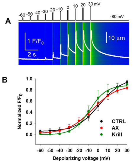 To assess whether four weeks of AX and krill oil treatment regimen had any effects on the excitation-contraction coupling of skeletal muscles, we examined calcium transients on single isolated FDB muscle cells using confocal microscopy conjugated with the whole-cell voltage clamp technique. While maintaining the holding potential at −80 mV, we applied 100 ms long square-shaped depolarization pulses between −60 mV and +30 mV, with 10 mV interval steps. Figure 2A shows a representative line-scan image recorded on a CTRL FDB fiber illustrating the applied protocol. Figure 2B shows the comparison of the normalized fluorescence from 13 CTRL (black), 10 AX (red), and 6 krill oil (green) treated fibers obtained from independent experiments like those shown in Figure 2A. The peaks of normalized F/F0 value for each depolarizing pulse were fitted with a Boltzmann function (see Equation (1) in Materials and Methods), then normalized to the obtained the maximum for the given fiber and ultimately averaged over the total number of fibers in each group (Table 3). By fitting a Boltzmann function to the averaged and normalized F/F0 values, the voltage dependence of calcium release can be characterized by the V50 (half activation voltage) and k values (slope of the Boltzmann curve). Based on the analysis of these parameters, we confirm no significant alterations in the release channel sensibility to voltage activation, although a slight non-significant negative shift was detected following nutraceutical diet.