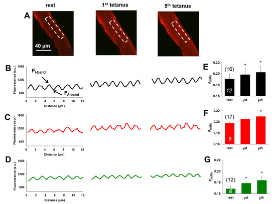 Figure 4A illustrate representative confocal images recorded at rest, after the first, and the fifth tetanic stimulation of a single FDB muscle fiber incubated with rhod-2-AM. Following 500 ms long tetani at close to supramaximal voltage we asserted the fluorescence averaged over the spatial domain (white rectangle) and show the activity dependent triadic mitochondrial rhod-2 fluorescence increase as depicted by the traces in Figure 4B–D. The normalized mitochondrial fluorescence (Fmito) evaluation was done similarly as in our earlier report [39]. Based on Equation (2) (see Materials and Methods) Fmito can be expressed as the differences between the peaks (I band fluorescence, corresponding to mitochondria) and troughs (A band fluorescence, corresponding to non-mitochondria or baseline). Figure 4E–G show the pooled mitochondrial fluorescence data for CTRL, AX, and krill oil supplemented groups, confirming the activity dependent mitochondrial accumulation starting from the resting state and immediately following the tetanic stimulation (0.192 ± 0.003, 0.198 ± 0.006 *, 0.202 ± 0.003 * for CTRL, 0.199 ± 0.002, 0.204 ± 0.002, 0.208 ± 0.002 * for AX and 0.168 ± 0.005, 0.178 ± 0.005 *, 0.183 ± 0.006 * for krill oil, respectively, with * p < 0.05 vs. rest). While as expected, Fmito shows an increasing tendency in each group, no significant changes were determined between the CTRL and nutraceutical supplemented groups.