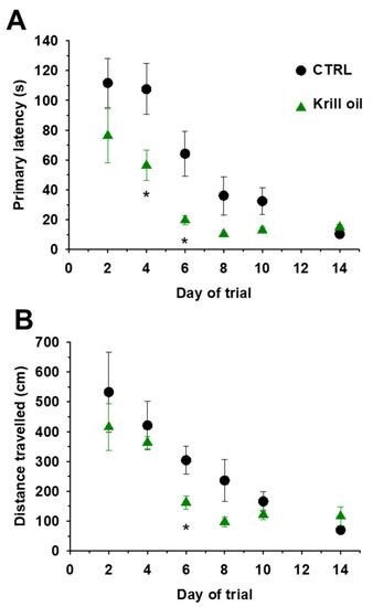 To study the effects of n-3 PUFAs that are present in krill oil but not in AX, we employed the Barnes–Maze experiment on control and krill oil fed mice. Over the course of repeated trials, the observed differences (if any) in the latency (duration) and distance (path) covered to the escape hole can be interpreted as an indicator of hippocampus-dependent memory function. Eight CTRL and eight krill oil treated mice were trained in the Barnes–Maze for 10 consecutive days and after three days’ resting period the final test was conducted. During the training days, the latency in entering the target hole (primary latency) and the distance travelled to it was measured. During the training period the mice were getting familiarized with the position of the escape tunnel and day-by-day spent less time (Figure 6A) and covered shorter distance finding the target hole (Figure 6B). The starting average time to the escape box and the covered distance was essentially same in both animal groups. Krill oil supplemented mice learned the right position of the escape tunnel quicker and they were more purposeful than control animals (Supplementary Figure S1 and Videos S1 and S2). A significant difference (p < 0.05) was found between the two animal groups during the learning period in latency (days 4–6) and distance (day 6). It must be acknowledged that the final average value of each measured parameter was the same in both animal groups.