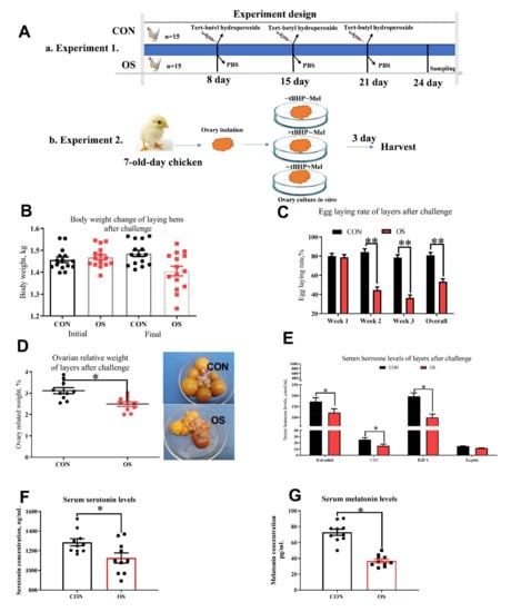 Oxidative stress (induced by tBHP) reduced egg-laying rate, ovary indices and serum hormone levels (Experiment 1). Data are means ± SEM represented by vertical bars or plot individual values ± SEM. (A) Schematic illustration of the experimental design. In Experiment 1, layers were fed the same basal diet for 24 days and with the tBHP (OS) or PBS (CON) injection at 9 AM of the d 8, 15, and 21. In Experiment 2, the ovaries of 7-day-old chickens are isolated for in vitro culture, and received different culture medium with 0 tBHP + 0 melatonin (−tBHP − Mel), 50 μmol/mL tBHP (+tBHP − Mel), and 50 μmol/mL tBHP + 100 ng/mL melatonin (+tBHP + Mel). (B) Body weight. (C) Egg-laying rate after challenge. (D) Ovarian relative weight. (E) Serum reproductive and metabolism-related hormone levels. (F) Serum serotonin levels, and (G) Serum melatonin levels. FSH = follicle-stimulating hormone, IGF-1 = insulin-like growth factor-1, CON = same dosage of PBS, OS = 800 μmol/kg BW of tBHP. Statistical significance was evaluated by t-test, * p < 0.05, ** p < 0.01.