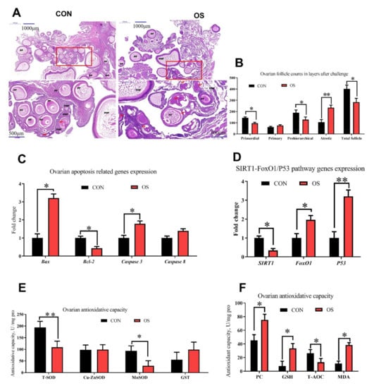 Oxidative stress (induced by tBHP) decreased ovary function (Experiment 1). (A,B) Ovarian histology of layers after 24 days treatment and follicle numbers at each developmental stage (PMF = primordial follicle; PF = primary follicle; PHF = prehierarchical follicle; AF = atretic follicle). (C,D) RT-PCR analysis for mRNA expression levels related to ovarian follicular apoptosis and antioxidant related gene expression. (E,F) Antioxidant capacity analysis for ovary with antioxidant enzyme activities and oxidation product. Data are means ± SEM represented by vertical bars or plot individual values (n = 10) ± SEM. CON = same dosage of PBS, OS = 800 μmol/kg BW of tBHP, Bcl-2 = B-cell lymphoma-2, SIRT1 = sirtuin 1, FoxO1 = forkhead box O1, T-SOD = total superoxide dismutase, GST = glutathione S transferase, PC = protein carbonyl, GSH = glutathione, T-AOC = total antioxidant capacity, MDA = malondialdehyde. Statistical significance was evaluated by t-test, * p < 0.05, ** p < 0.01.