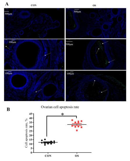 Oxidative stress (induced by tBHP) increased the cell apoptosis rate of ovary (Experiment 1). (A) TUNEL analysis for cell apoptosis in ovary; (B) The immunofluorescence results of TUNEL with the green color presents the positive cells. Data are plot individual values (n = 10). CON = same dosage of PBS, OS = 800 μmol/kg BW of tBHP. Statistical significance was evaluated by t-test, * p < 0.05.