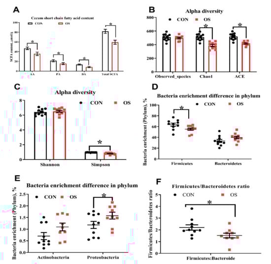 Oxidative stress (induced by tBHP) reduced cecal short chain fatty acid concentration (Experiment 1). Data are means ±SEM represented by vertical bars or plot individual values. (A) Short chain fatty acid concentration in cecal digesta. (B,C) Alpha diversity of cecum microbiota, with Observed species, Chao 1, ACE (B) and Shannon and Simpson index (C). (D–F). The difference n = 10. Statistical significance was evaluated by the Student’s t-test, * p < 0.05.