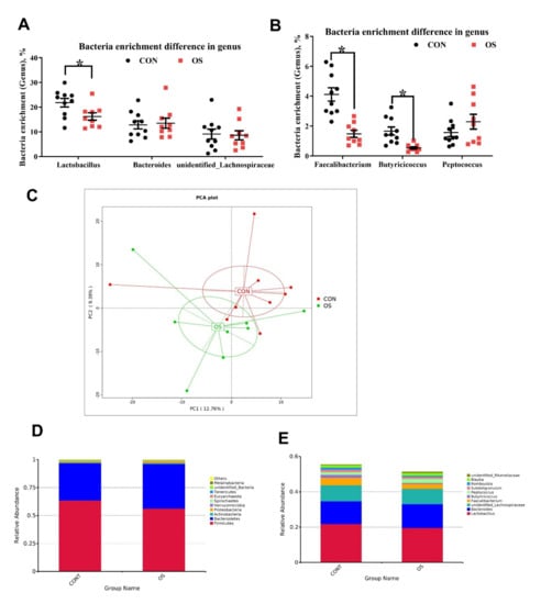 In this study, although the cecal microbiota of the OS group was slightly similar to that of the CON one, the abundance of Marinifilaceae, Odoribacter and Bacteroides_plebeius in the OS group was significantly increased. Bacteroidetes are plant polysaccharide degraders and propionate producers that can improve intestinal barrier function and reduce inflammation and oxidative stress [46,61]. It has been reported that the relative abundance of Bacteroides is enriched in the gut of the host treated with antioxidants [62]. Our observation is in agreement with that of Wang [63], who found that oxidative stress significantly increases the relative abundance of Bacteroides_f_Bacteroidaceae in the gut of sows.