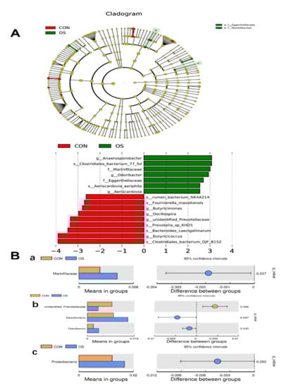 Oxidative stress (induced by tBHP) changed microbiota enrichment (Experiment 1). Data are means ±SEM represented by vertical bars or plot individual values. (A) Linear discrimination analysis coupled with effect size (LEfSe) identified most differentially abundant taxa in the cecum with LDA significant threshold > 3 were shown. (Red) CON enriched taxa; (Green) OS enriched taxa. (B) Analysis of different species between groups at different levels. (a) Family, (b) Genus, (c) Species. The difference n = 10. Statistical significance was evaluated by the Student’s t-test.