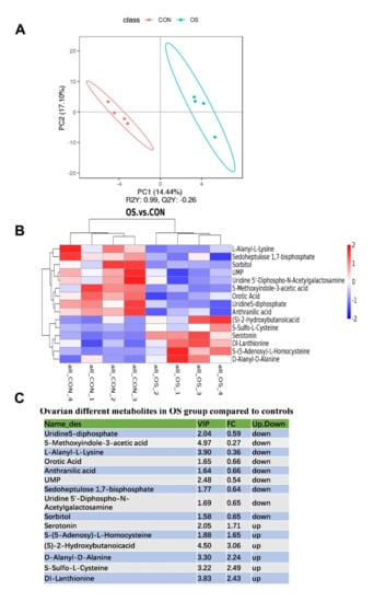Oxidative stress (induced by tBHP) changed the serum metabolites. (A) The principal component analysis (PCA) of the serum metabolites. (B) Heatmap of the different serum metabolites. (C) Ovarian different metabolites in OS group compared to controls. p < 0.05.