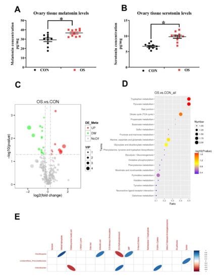 Oxidative stress (induced by tBHP) reduced increased serotonin and melatonin levels in the ovary and changed body amino acid biosynthesis and metabolism. (A) Ovarian tissue melatonin levels. (B) Ovarian tissue serotonin levels. (C) Description of the different metabolites between OS and CON group by volcano plot. (D) KEGG pathway enrichment of target metabolites. (E) Spearsman Correlationship between metabolites and microbiota. Statistical significance was evaluated by the Student’s t-test, * p < 0.05.