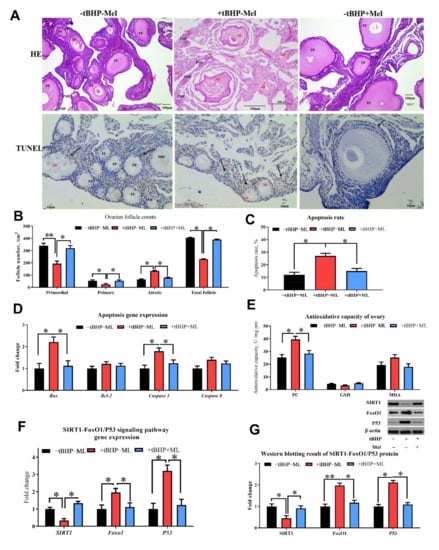 Melatonin ameliorates oxidative stress (tBHP) induced ovarian dysfunction in vitro (Experiment 2). (A,B) Ovarian histology and TUNEL analysis of layers after three days of treatment and follicle counts at each developmental stage (PMF = primordial follicle; PF = primary follicle; AF = atretic follicle). TUNEL analysis for cell apoptosis in ovary (A,C) showed the TUNEL results with the brown color presents the positive cells. (D) RT-PCR analysis for mRNA expression levels related to ovarian apoptosis gene expression. (E) Antioxidant capacity analysis for ovary with oxidation product. (F,G) the western blotting result of apoptosis associate protein (Bax, Bcl-2, caspase 3 and cleaved-caspase 3). Data are shown as averages and error bars represent SEM± SEM; statistically significant differences are shown with different letters (p < 0.05) with one-way ANOVA with Tukey’s test. −tBHP − Mel = 0 tBHP + 0 melatonin, +tBHP − Mel = 50 μmol/mL tBHP, +tBHP + Mel = 50 μmol/mL tBHP + 100 ng/mL melatonin, Bcl-2 = B-cell lymphoma-2, SIRT1 = silent information regulator 1, FoxO1 = forkhead box O1, PC = protein carbonyl, GSH = glutathione, MDA = malondialdehyde. Statistical significance was evaluated by t-test, * p < 0.05, ** p < 0.01.