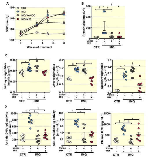 Topical IMQ, a TLR7 agonist, was used to induce lupus-like disease in mice not genetically prone to excessive TLR7 signalling, it was administered topically three times a week in alternate days to wild-type BALB/c mice []. IMQ exposition showed a high incidence of mortality [,]. The mouse mortality rate in each group treated with IMQ was the following: IMQ group, 25%, 2 dead mice out of 8; IMQ-VANCO group, 0%; and IMQ-MIX group, 12.5%, 1 dead mouse out of 8. As expected, IMQ-treated mice showed a progressive raise in systolic blood pressure (SBP) (Figure 1A), being approximately 35 mmHg higher in IMQ-treated animals than in CTR animals, at the experimental endpoint. No significant changes in heart rate were detected in the IMQ group (530.3 ± 23.9 bpm vs. 540.7 ± 20.3 bpm, CTR and IMQ groups, respectively).