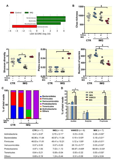 Effects of treatment with antibiotics on ecological indices and microbial phyla of in the gut from imiquimod (IMQ) mice. (A) Linear discriminant analysis Effect Size (LEfSe) recognized significant differences in bacterial taxa enriched in each cohort at LDA Score > 3.5, and Kruskal–Wallis test amongst classes and Wilcoxon test amongst subclasses with threshold 0.05 (red bars Control enriched, green bars IMQ enriched). (B) Ecological parameters, (C) Proportion of bacterial phyla, and (D) Proportion of SCFAs-producing-bacteria in the microbiota from control (CTR), IMQ and IMQ-groups treated with Vancomycin (VANCO) or our cocktail of antibiotics (MIX). Data is represented as means ± SEM. One-way ANOVA and Tukey post hoc test (ecological parameters, and phyla proportion), two-way ANOVA with the Tukey’s multiple comparison test (SCFA-producing bacteria proportion). * p < 0.05 compared to CTR group; * p < 0.05, † p < 0.01, ‡ p < 0.001 compared to the untreated IMQ group.