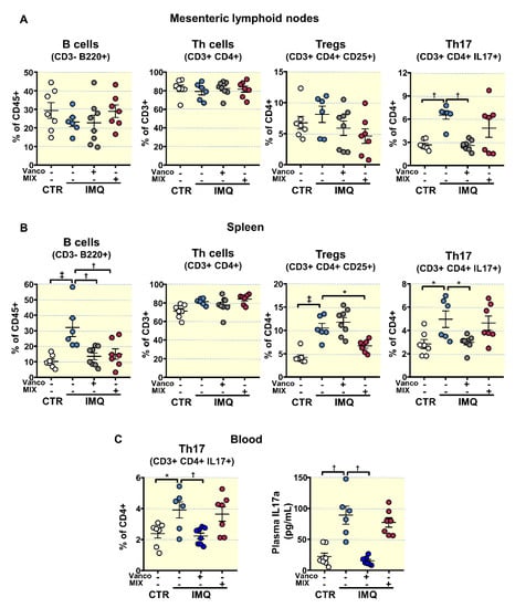Effects of treatment with antibiotics on lymphocyte activation and proliferation in imiquimod (IMQ) animals. (A) Total B lymphocytes, T helper (Th), Regulatory T (Treg), and Th17 cells as detected with flow cytometry in mesenteric lymph nodes, (B) in spleen, and (C) blood Th17 cells and plasma IL17a levels from control (CTR), IMQ and IMQ concomitantly treated with Vancomycin (VANCO) or our cocktail of antibiotics (MIX). Data is represented as means ± SEM. The variables were tested with one-way ANOVA and Tukey post hoc test. Plasma IL17a levels were compared using Kruskal–Wallis with Dunn’s multiple comparisons test. * p < 0.05, † p < 0.01, ‡ p < 0.001 compared to the CTR group; * p < 0.05, † p < 0.01 compared to the untreated IMQ group.