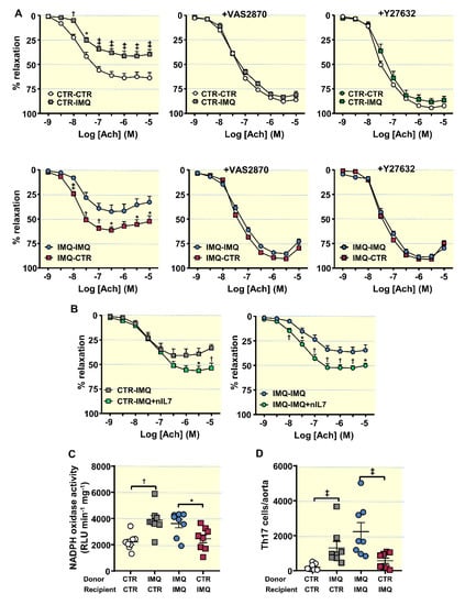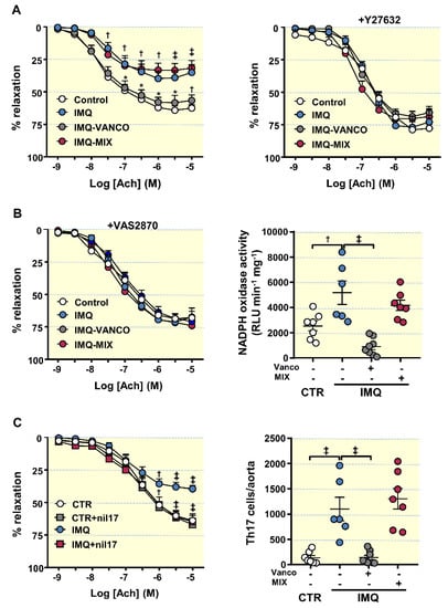 IMQ-treated animals presented strongly reduced endothelium-dependent vasorelation to ACh (acetylcholine) in comparison CTR animals (Emax = 39.7 ± 6.2% and 64.1 ± 3.6%, respectively, p < 0.01) (Figure 4A). VANCO was able to improve this impairment, being without effect MIX. The ACh-induced response was also improved in aorta segments from IMQ-treated animals post-Y27632 incubation (a Rho kinase inhibitor) (Figure 4A), suggesting that the decreased relaxation with ACh is mediated, at least partially, by Rho kinase activation. The activation of RhoA/Rho kinase by ROS has already been previously described []. NADPH oxidase is the main source of ROS in the vascular wall; thus, we tested the relaxation to ACh in the presence of the selective NADPH oxidase inhibitor VAS2870, and the NADPH oxidase activity in all experimental groups (Figure 4B). In the presence of VAS2870, improvement of endothelium-dependent relaxation to acetylcholine was observed in aortic rings from IMQ group, being similar to that found in CTR group, which suggest the involvement of NADPH oxidase activity in the endothelial dysfunction found in aortic rings from IMQ mice. In fact, the NADPH oxidase activity was approximately 2-fold more elevated in segments of IMQ mice than in aortic segments of CTR animals. In agreement with this, MIX treatment, which was unable to improve the relaxation to acetylcholine, showed an NADPH oxidase activity similar IMQ rings, whereas rings from VANCO group showed lower NADPH oxidase activity than IMQ group. To further explore the role of IL-17a in endothelial dysfunction induced by IMQ, we incubated for 6 h with anti-IL-17a antibody. The neutralization on IL-17a improved the relaxation to acetylcholine in rings from IMQ group, but not in control rings (Figure 4C). Considering that Th17 cells boosted vascular ROS synthesis, we determined aortic infiltration levels of Th17 lymphocytes. Th17 infiltration was higher in aorta from IMQ than in CTR, which was reduced by vancomycin but not by MIX treatment (Figure 4C). Interestingly, when control mice were treated with VANCO or MIX no significant changes were observed in the relaxation to acetylcholine (Figure S5C) or in the NADPH oxidase activity (Figure S5D), as compared to untreated control mice.
