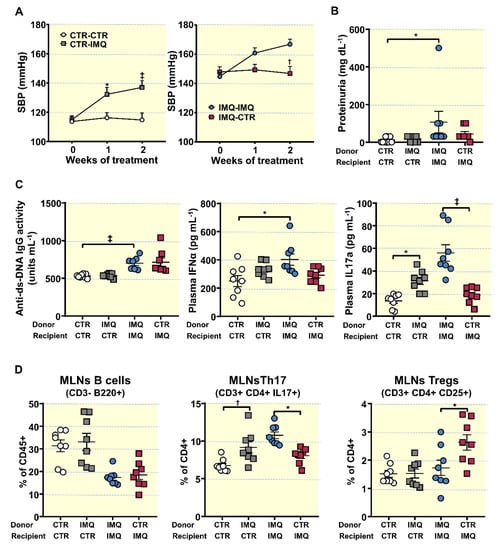 Effects of faecal microbiota transplants (FMT) on the progression of systolic blood pressure (SBP), proteinuria, disease activity, plasma cytokine levels, and lymphocyte proliferation in mesenteric lymph nodes. (A) SBP determined via tail-cuff plethysmography. (B) Proteinuria, (C) Plasma double-stranded DNA (anti-ds-DNA) autoantibodies, interferon (IFN)α, and interleukin (IL)17a levels. (D) Populations of relevant lymphocytes in mesenteric lymph nodes: Total B lymphocytes, Th17, and Regulatory T cells (Treg), obtained with flow cytometry. Data is represented as means ± SEM. The evolution of tail SBP was analysed by two-way ANOVA with the Tukey’s multiple comparison test. The rest of variables by unpaired t-test. * p < 0.05, † p < 0.01, ‡ p < 0.001 compared to the CTR-CTR group; * p < 0.05, † p < 0.01, ‡ p < 0.001 compared to IMQ-IMQ group. CTR-CTR, Control mice (CTR) transplanted with microbiota from CTR; CTR-IMQ, CTR mice transplanted with microbiota from imiquimod (IMQ)-treated mice; IMQ-IMQ, IMQ transplanted with microbiota from IMQ; and IMQ-CTR, IMQ transplanted with microbiota from CTR.