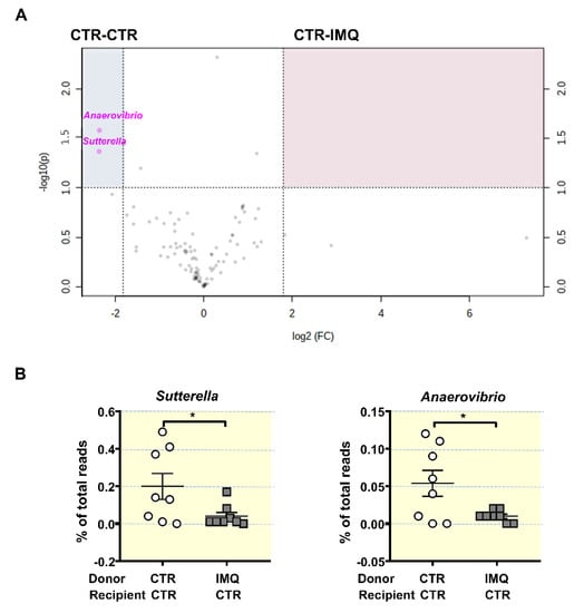 Next, tested the microbial composition 2 weeks post-transplant. Microbiota from donor CTR and IMQ mice changes after FMT in recipient mice (Figure S9A), but with minor changes depending if recipient mice were CTR or IMQ mice. At the end of FMT donor microbiota from control mice showed increased bacteria belonging to Bacterioidetes (75.18 ± 3.43% vs. 55.06 ± 8.55%, p < 0.05) and reduced Actinobacteria (0.09 ± 0.01% vs. 0.15 ± 0.03%, p < 0.05) in recipient IMQ mice in comparison with recipient CTR mice, respectively. Similarly, donor microbiota from IMQ mice showed only reduced bacteria belonging to Tenericutes (0.08 ± 0.02% vs. 0.25 ± 0.04%, p < 0.01) in recipient IMQ mice as compared to recipient CTR mice. We found no significant changes in phyla composition between CTR-CTR and CTR-IMQ groups (Figure S9B). Volcano plot showed genera clustering in CTR-CTR mice as compared to CTR-IMQ group (Figure 7A). There was more than 3.5-fold reduction in the genera Sutterella and Anaerovibrio (potentially protective bacteria) in mice receiving IMQ microbiota in comparison with CTR-CTR mice (Figure 7B). By contrast, FMT of donor control faeces to IMQ-treated mice induced changes in the microbiota composition as compared to the transplantation with IMQ microbiota. The LDA score suggests that the relative abundance of 4 taxa (green) was decreased and 15 taxa (red) was increased in IMQ-CTR group when compared with IMQ-IMQ mice (Figure S10). The most altered genera abundances of the volcano plot showed increased proportion of Sutterella, Anaerovibrio, Heliorestis, Sharpea, Anaerobranca, and Halanaerobium, and reduced abundance of Pseudovutyrivibrio, Moryella, and Streptococcus in IMQ-treated mice transplanted with microbiota from control mice, as compared to IMQ-IMQ group (Figure S11A,B).