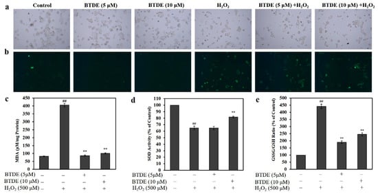 3.4. BTDE Alleviates H2O2-Induced ROS Generation, Decreased MDA Level and GSSG/GSH Ratio, and Increased SOD Activity