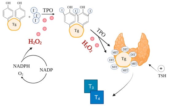 Role of ROS in thyroid hormones synthesis. Based on [47,56]. Created with BioRender.com.(accessed on 26/08/2021) I—iodine, TPO—thyroid peroxidase, Tg—thyroglobulin, MIT—monoiodotyrosine, DIT—diiodotyrosine, T3—triiodothyronine, T4—thyroxine.