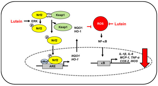 Oxidative stress and inflammation of neural tissues induce age-related macular degeneration and Alzheimer’s disease. The Irish longitudinal study demonstrated the relationship between lutein, a plasma antioxidant, and improved cognitive function in healthy older adults [31]. Moreover, lutein depletion was observed in individuals with mild cognitive impairment [32] and Alzheimer’s disease [33,34]. A study using data from the third Nutrition and Health Examination Survey (NHANES III) database and the NHANES III Linked Mortality File suggested that high levels of lutein reduce the risk of mortality due to Alzheimer’s disease in older adults [35]. Severe traumatic brain injury is involved in oxidative stress-induced inflammation and apoptosis [36]. Lutein protected against severe traumatic brain injury by suppressing IL-1β, IL-6, MCP-1 expression and reducing serum reactive oxygen species (ROS) levels in rats with severe traumatic brain injury [37]. Additionally, lutein attenuated neuroinflammation in lipopolysaccharide-activated microglia by inhibiting inflammatory signaling such as NF-κB and expression of TNF-α, IL-1β, inducible NO synthase (iNOS), and cyclooxygenase-2 (COX-2). Lutein promoted nuclear factor erythroid 2–related factor 2 (Nrf2) activation and subsequent upregulation of heme oxygenase (HO)-1 and NAD(P)H: quinone oxidoreductase 1 (NQO1). The effect of lutein for Nrf2 activation was mediated with extracellular signal-regulated kinase (ERK) [38]. Mitogen activated protein kinases, including ERK phosphorylate Nrf2, in modulating the Nrf2-dependent antioxidant response [39]. Therefore, lutein may activate ERK, which phosphorylates Nrf2 to translocate into the nucleus and induces the expression of antioxidant enzymes. These results demonstrated that lutein induced the expression of Nrf2-target genes (antioxidant enzymes) and reduced the levels of inflammatory mediators to protect against inflammation-related neurodegenerative disorders (Figure 1).