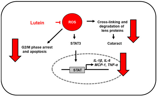 The proposed mechanism by which lutein inhibits oxidative stress-induced inflammatory responses in the eye. ROS levels increase in aged retina and lipopolysaccharide-stimulated retinal pigment epithelial cells. Lutein reduces ROS levels and inhibits ROS-mediated activation of STAT3 [7] and the expression of inflammatory mediators (IL-1β, IL-6, MCP-1, TNF-α) [7,49,57]. Thus, it prevents age-related macular degeneration. In addition, lutein prevents oxidative stress-mediated G2/M arrest and apoptosis in retinal pigmental epithelial cells [48] and cross-linking and degradation of lens proteins which prevents cataractogenesis [56]. IL, interleukin; MCP-1; monocyte chemoattratant protein-1; ROS, reactive oxygen species; STAT, signal transducer and activator of transcription; TNF-α, tumor necrosis factor-α.