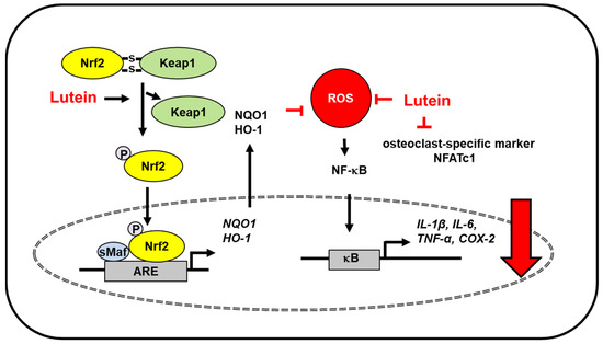 The proposed mechanism by which lutein inhibits oxidative stress-induced inflammatory responses in bone. ROS levels increase in monosodium iodoacetate-induced osteoarthritis in primary chondrocyte cells and femur tissues of ovariectomized rats (osteoporosis model). Lutein reduces ROS levels and inhibits ROS-mediated activation of NF-kB and the expression of inflammatory mediators (IL-1β, IL-6, TNF-α, COX-2). Moreover, lutein increases dissociation of Keap1 from Nfr2/Keap1 complex and thus, promotes nuclear translocation of Nrf2, which forms a heterodimer with sMaf protein and binds to the regulatory region of DNA called ARE. It induces the expression of Nrf2- target antioxidant genes (HO-1, NQO1). These antioxidant enzymes reduce intracellular ROS levels, which suppresses inflammatory responses [58,59]. In addition, lutein inhibits osteoclast-specific marker NFATc1 in the bone of ovariectomized rats [59]. Thus, lutein prevents oxidative stress-mediated osteoarthritis and bone deterioration. ARE, antioxidant response element; COX-2, cyclooxygenase-2; HO-1, hemeoxygenase-1; IL, interleukin; Keap1, kelch like ECH associated protein 1; NF−κB, nuclear factor-κB; Nrf2, nuclear factor erythroid 2–related factor 2; NQO-1, NAD(P)H:quinone oxidoreductase 1; NFATc1, nuclear factor of activated T cells 1; ROS, reactive oxygen species; sMaf, small Maf; TNF-α, tumor necrosis factor-α.