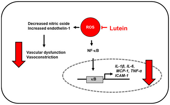 The proposed mechanism by which lutein inhibits oxidative stress-induced inflammatory responses in vascular endothelial cells. ROS levels increase in vascular endothelial cells exposed to high concentrations of homocysteine (atherosclerosis model) or lipopolysaccharide. Lutein reduces ROS levels and inhibits ROS-associated activation of NF-kB and expression of inflammatory mediators (IL-1β, IL-6, MCP-1, TNF-α, ICAM-1) in endothelial cells [71,76]. Moreover, lutein inhibits ROS-induced vascular dysfunction (decreased nitric oxide and increased endothelin-1), and thus, prevents vasoconstriction [71]. ICAM-1, intercellular adhesion molecule 1; IL, interleukin; MCP-1; monocyte chemoattratant protein-1; NF−κB, nuclear factor-κB; ROS, reactive oxygen species; TNF-α, tumor necrosis factor-α.