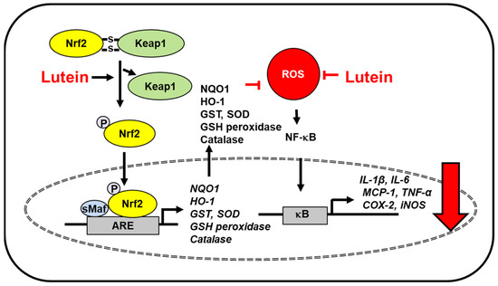 Due to its free radical scavenging activity, lutein reduces oxidative stress and inflammatory responses in various organs. Inflammatory stimuli and environmental stress, including UV light, may increase the production of ROS. Lutein reduces ROS levels and inhibits ROS-mediated activation of NF-kB and STAT3, and thus the expression of inflammatory mediators (IL-1β, IL-6, MCP-1, TNF-α, COX-2, iNOS). Lutein promotes Nrf2 activation and the expression of Nrf2- target antioxidant genes (HO-1, NQO1, GST, SOD, glutathione peroxidase, catalase) to reduce ROS levels. Since lutein reduces oxidative stress, it maintains the levels of endogenous antioxidants such as glutathione. The inhibitory effects on inflammatory signaling pathways and enhanced antioxidant activities of lutein may be the underlying mechanisms of protection against inflammation-related diseases.