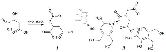 2.2.2. Synthesis of Compound II Di(3-hydroxy-4,5-bis(hydroxymethyl)-2-methylpyridinium) Salt of 2-(Nitrooxy)butanedioic Acid