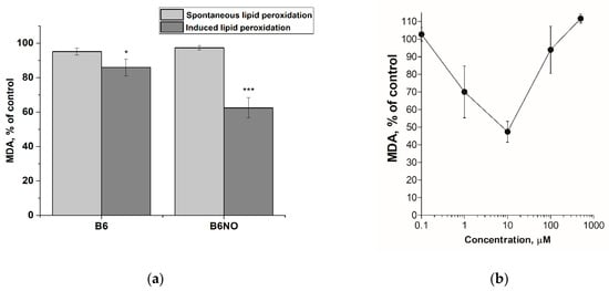 (a) Influence of hybrid molecule B6NO and vitamin B6 at a concentration of 30 μM on the spontaneous and iron-initiated lipid peroxidation process of rat brain homogenate. The concentration of Fe(II) was 500 μM. Significant differences are shown as * p < 0.05; *** p < 0.001. (b) Concentration dependence of the B6NO effect on iron-initiated lipid peroxidation.