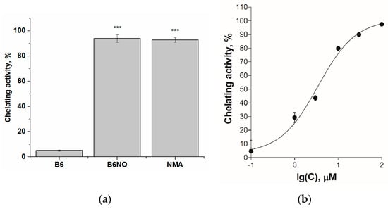 (a) Fe(II)-chelating activity of the B6, B6NO and nitromalic acid (NMA) at a concentration of 30 μM. Significant differences are shown as *** p < 0.001.; (b) Concentration dependence of the increase in Fe(II)-chelating activity of the B6NO hybrid molecule.