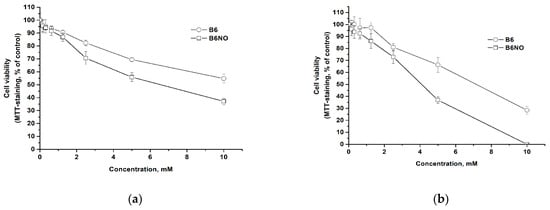 Since B6NO is a vitamin derivative, it is expected to have low cytotoxicity. The influence on the normal and tumor cells viability was carried out using the MTT test method 24 h after the action of the test compounds. The results are shown in the Figure 4.