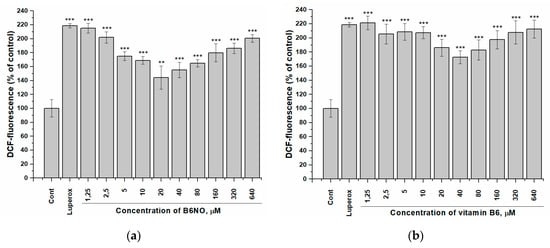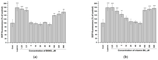 Influence of B6NO and vitamin B6 on the intracellular ROS formation initiated by tert-Butyl peroxide in HepG2 cells and measured using the DCFH-DA assay. Cells were treated with 25 µM tert-Butyl peroxide (Luperox®) for 30 min and pre-treatment with (a) B6NO or (b) vitamin B6 at 1.25−640 µM for 24 h. Significant differences are shown as ** p < 0.01; *** p < 0.001.
