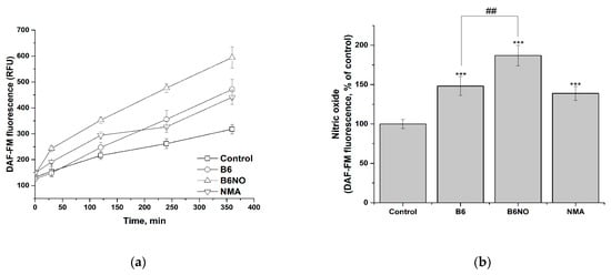 Influence of B6NO, vitamin B6 and NMA on the intracellular NO formation in HepG2 cells and measured using the DAF-FM assay. Time dependence of intracellular nitrogen monoxide concentration (a) and relative concentration of intracellular nitrogen monoxide after 6 h of exposure to compounds (b). Significant differences are shown as ** p < 0.01; *** p < 0.001 vs. control; as ## p < 0.01 B6NO vs. vitamin B6.
