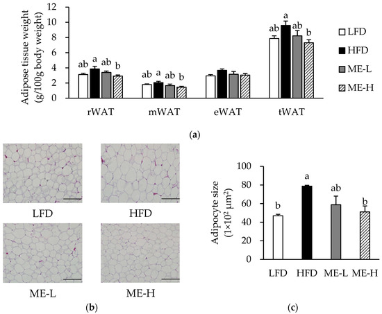 In the HFD group, the weights of the retroperitoneal white adipose tissue (rWAT), mesenteric white adipose tissue (rWAT), epididymal white adipose tissue (rWAT), and total white adipose tissue (tWAT) tended to be higher than those in the LFD group (Figure 1a). In contrast, the ME-H group showed lower weights of rWAT, mWAT, and tWAT compared to the HFD group (p < 0.05; Figure 1a). The average adipocyte size of the HFD group was greater than that of the LFD group (p < 0.05); however, in the ME-H group, the adipocyte size was significantly smaller compared to the HFD group (p < 0.05; Figure 1b,c).