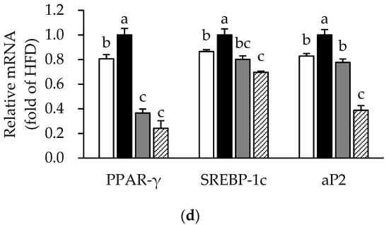 Since the ME inhibited adipocyte hypertrophy, we further analyzed the mRNA expression of genes related to adipogenesis in WAT. The mRNA expression levels of peroxisome proliferator-activated receptor (PPAR)-γ, sterol regulatory element-binding protein-1c (SREBP-1c), and adipocyte protein 2 (aP2) were significantly higher in the HFD group compared to the LFD group (p < 0.05); however, the mRNA expression levels of PPAR-γ, SREBP-1c, and aP2 in the ME-L and ME-H groups were significantly lower compared to those of the HFD group (p < 0.05; Figure 1d).