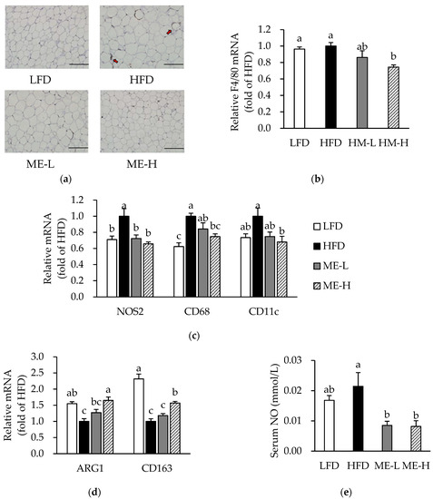 This study identified adipose tissue macrophage infiltration by IHC-staining and qRT-PCR analysis for F4/80. As shown in Figure 3a, macrophages in the HFD group formed a crown-like structure (CLS) surrounding adipocytes, but few CLSs were found in the other groups. The F4/80 mRNA levels did not differ significantly between the LFD and HFD groups; however, the F4/80 mRNA level of the ME-H group was lower than that of the HFD group (p < 0.05; Figure 3b).