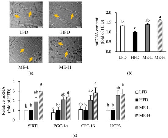 Figure 5a shows the representative TEM images of skeletal muscle. In the HFD group, the number and size of mitochondria tended to be lower than in the LFD group; however, mitochondria in the ME groups appeared to be more numerous and larger in size than those of the HFD group. Therefore, we next analyzed mitochondrial mass, which reflects the number and size of mitochondria, by measuring the mtDNA content []. According to the qPCR analysis, the content of mtDNA in the HFD group was significantly lower than that in the LFD group; however, both the ME-L and ME-H groups had more mtDNA compared to the HFD group (p < 0.05; Figure 5b).