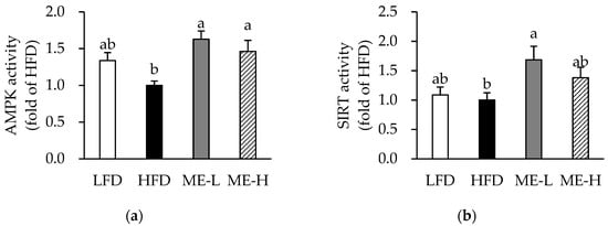 The skeletal muscle AMPK activities of the ME-L and ME-H groups were significantly higher compared to that of the HFD group (p < 0.05; Figure 6a). In addition, the SIRT activity of the ME-L and ME-H groups was higher than that of the HFD group, and a statistically significant difference was observed in the ME-L group specifically (p < 0.05; Figure 6b).