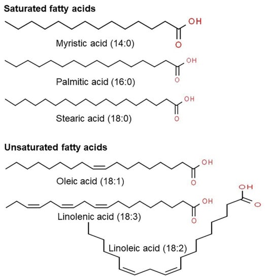 The nutritional benefits of oats as a food product have been studied in different ways. As shown in Table 1, oats are a good source of high-quality proteins, carbohydrates, dietary fibers such as β-glucan and soluble dietary fibers, fat, minerals, phenolic acids, flavonoids, and antioxidants [,,]. Compared to other grains, proteins in oats are superior in quantity and quality, especially for humans and non-ruminants, based on the composition of essential amino acids. Seed storage proteins of grains are divided into globulins, which are soluble in salt, and prolamins, which are soluble in alcohol [,]. Among essential amino acids, lysine, which plays a crucial role in protein biosynthesis, is particularly important as this amino acid cannot be synthesized and must be obtained from the external environment in mammals []. Grains are a preferred source of these essential amino acids. In particular, proteins in oats are rich in lysine and have a higher ratio of globulin proteins than other grains that have a high prolamin content []. Oats generally contain 3–11% of fat, and several strains contain up to 18% of fat. In addition, most of the fats in oats are stored in the endosperm compared to other grains that store a high fat content in the germini and germinal disk []. Fatty acids in oats include oleic (18:1), linoleic (18:2), and linolenic acid (18:3), which are unsaturated fatty acids, and myristic (14:0), palmitic (16:0), and stearic acid (18:0), which are saturated fatty acids (Figure 1) [,]. Among these, oats contain high amounts of oleic, linoleic, and palmitic acid. Oleic and linoleic acid are nutritionally essential unsaturated fatty acids, and palmitic acid prevents peroxidation of fat, which causes toxicity and reduces the flavor of grains [,]. Thus, oats contain nutritionally excellent fat content and fatty acid composition []. However, depending on the use of the grain, it is necessary to evaluate the fat content in more detail. The energy value of fat (37 kJ/g) is much higher than that of proteins or carbohydrates (16–17 kJ/g) [,]. Thus, grains with high fat content are generally preferred for animal feeds and not for consumption by humans because they lack flavor and brown excessively during cooking [,].