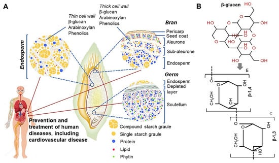 Structural diagram of the seed-derived cellular components from different oat tissue, including bran, germ, and endosperm, and nutrient distribution and organization within these tissues (A) [,], and chemical structure of β-glucan linked to β-1,3 and β-1,4 bridge (B).