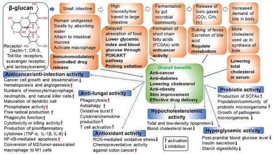 Human health benefits of β-glucan associated with anti-cancer/anti-infection, anti-fungal, antioxidant, hypocholesterolemic, hyperglycemic, and probiotic activity. Binding receptors for β-glucan have been known to be dectin-1, complement receptor 3 (CR3), scavenger receptor, and lactosylceramid. Of these, dectin-1 is a major receptor [,,,,].