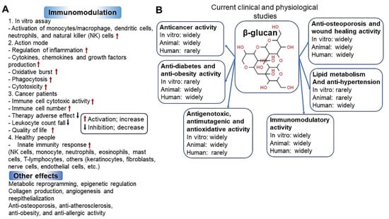 Immunomodulatory activity (A) [] and clinical and physiological perspectives (B) [] of β-glucan.